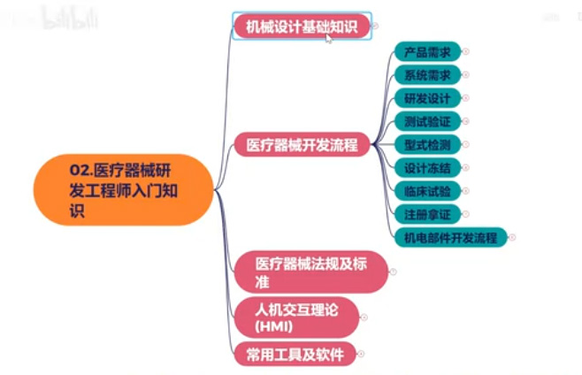 系统需求由器械研发工程师承接,器械研发工程师需要将系统需求转化为不见设计规范。并对系统指标进行分解。细化为不见设计的指标。并且定义这些指标的测试方法。然后进行部件结构的设计、打样验证和优化迭代工作。测试的目的是为了验证部件系统的设计是不是满足产品的要求。分为了不见测试、集成测试、系统测试、法规测试、风险测试、可用性测试、内部动物试验。都是为了不见跟系统的确认。确保设计要符合要求。这些测试项目都通过后就可以进行国家药监局的检测了。型式检测通过,需求文档、设计规范、物料验证、BOM、图纸、测试文档及报告、工艺SOP等冻结受控。将研发状态转换成为可以量产状态。小批量试产,为临床试验做好准备。生产的样机需要完成临床试验的验证。动物临床试验,临床数据分析等。动物试验是为临床试验做准备。通过临床试验、医生使用器械在病患身上做手术。确认系统功能满足临床使用要求。试验期间的临床数据和医生的反馈。作为下一代产品研发需求的输入。进行产品的迭代。临床试验通过后,提交临床数据和,型式检测报告,在国家药监局提交,注册申请,拿证获批后即可上市。医疗器械法规及标准,人机交互理论,常用工具跟软件。