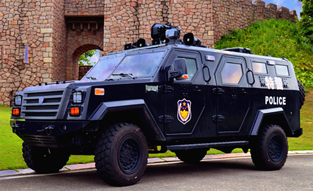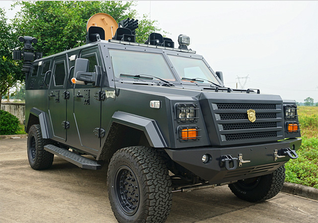 国产“黑豹”防暴装甲运兵车是根据美国进口福特E350改装而成的5吨级防爆装甲车。该车可搭载8名特警队员,整车长5.8米,宽2.2米,高2.3米。车身采用进口防弹材料制作并采用自主重叠式的防弹结构,防护性能优越。该车试用于军队、武警、公安、边防等部门执行反恐维稳、边防巡逻、缉毒抓捕等任务。防暴装甲运兵车该车还有5个车门,以确保队员快速上下。超大马力的进口发动机,使得整车动力强劲,最高时速达140km/h。特警支队相关负责人介绍:这辆“黑豹”防爆装甲车可执行追铺、反恐、侦查、巡逻等任务。防暴装甲运兵车同时配备了防弹轮胎,轮胎在中弹和刮破后任可继续前行80多公里。该车车身四面防弹,前后装有防撞保险杠,每个窗口都安装了双层防弹玻璃,车身周围有8个射击窗口,在防爆突出过程中可发挥巨大作用。国产“黑豹”车身上方配有38mm九管催泪炮,催泪炮可进行360度旋转,最大仰角高达60度,射程至少200米以上。该车还配置了LED警灯警报系统和升降聚光照明灯,在处突过程中可以给犯罪分子造极大的震慑作用,极大地提升了人民群众的安全感、满意度。