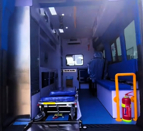 越野救护车的医疗舱,后门的右边是一个铲式担架的固定位置。左边挂着的是一个楼梯担架,医疗舱的中间是一套自动上车担架。左侧是一个医疗柜,是带卷帘门的氧气瓶,两个双15升的氧气瓶。还有医疗器械柜。在上面有四个上掀门式的柜门。中间是一组吊柜,下面是一组平台柜。上面有220伏的电源插座,还有12伏的电源接口。旁边做了汇流排,可以显示氧气瓶罐的压力。还有两个用氧终端,下面做了一台这个负压设备。左前舱有特别的装置,所有车辆的集中控制,都在液晶大屏幕上面。上面有比较齐全的参数,功能项非常的全面。中间隔断顶部有个车载式空气消毒机。中间是一个透明的观察窗。折叠椅对讲设备还有安全锤。车顶也做了220伏的电源插座。紫外线消毒灯,它是带延时消毒的。右边上部也是一样有吊柜。也是非常实用的,右侧有单人座椅配备三点式的安全带。后面是三人的长条座椅,全部都配备了安全带,座椅都做了骨架结构非常的牢固。车都是做了大面积的软包。防撞美观都是不错的。救护车我们也可以从中门下去。有上下车踏板。