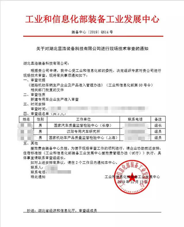 2019年12月19日迎来了工信部委派的三位技术审查专家,三位专家对显浩申请的专用车企业准入进行现场技术审查。依据《道路机动车辆生产企业及产品准入管理办法》(工业和信息化部第50号令)经过三天的严格审查。专家对显浩在送血车、检测车、监测车、冷藏车等专用车的研发、生产、销售、售后服务等能力方面给予高度认可,并一次性通过了现场审查。随后将审查情况及材料汇报国家工信部专家组审查。