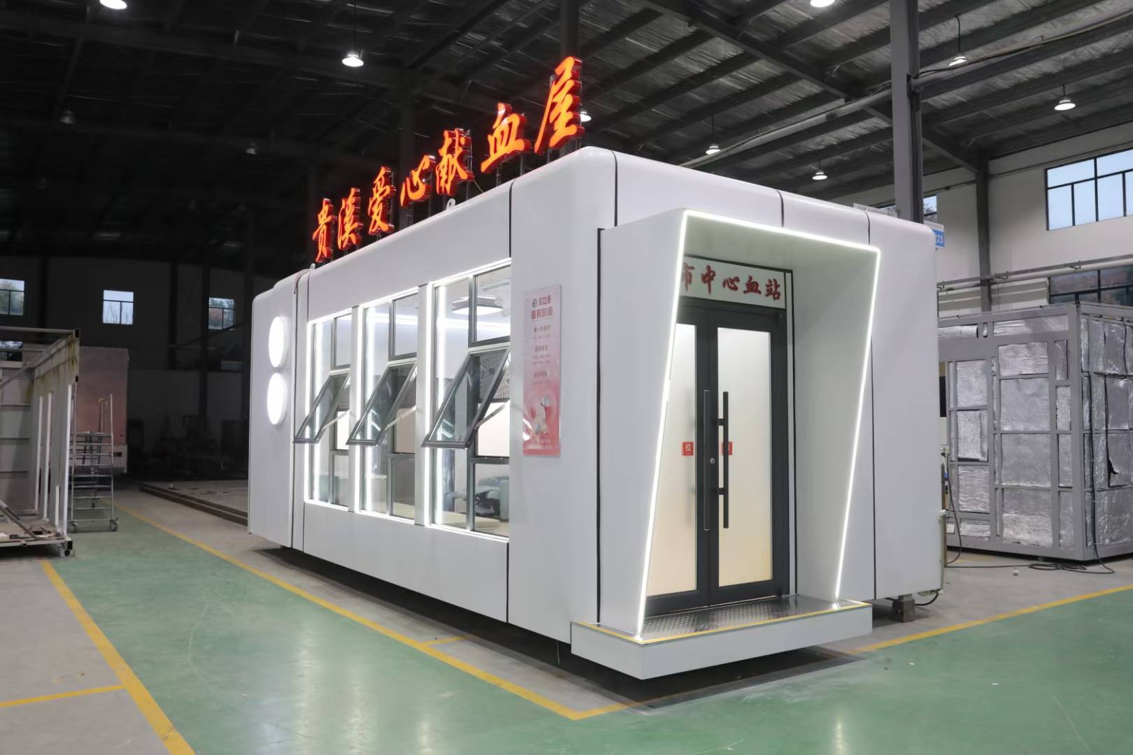 无偿献血让爱传递,移动献血屋有30几平方米。可以配备LCD广告显示屏,用于播放日常的爱心献血宣传广告。然后做了一个大大的爱心造型,三层中空的钢化玻璃的整个采光透光性是非常好的。它是属于镜面玻璃,外面看不到里面,从里面可以看到外面,可以起到一个很好的隐私保护作用。献血屋的外墙采用全铝材质,大门是双拉门配备指纹密码锁。外观设计简洁大方的,色调为暖色调红色白色为主。进门的是前台区域,用于正常的登记,体检台、化验台、等候区、采血区、休息区。还有更衣室,可以供献血人员和医护人员更换衣服。洗手池,柜子可以放微波炉、咖啡机等。有沙发可以供献血者来休息,采血区域配备了采血台、采血椅热合台。还有储存血液的冰箱。机采椅既可以坐也可以躺着采血。还可以上下调节。坐起来非常的舒坦。大大提高采血人员的舒适度。还剩余的空间放置机采设备。储存柜可以让献血者放私人用品。