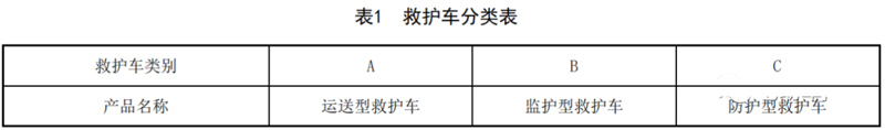按产品功能和用途,将救护车分为3类,分类见表1。