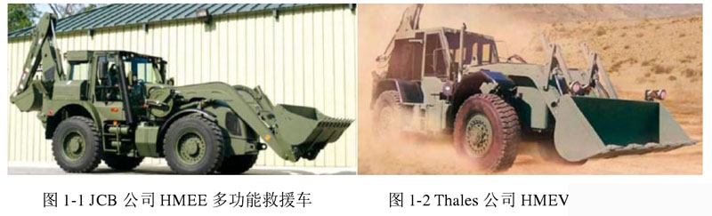 当今世界范围内,英美日澳等发达国家研制的多功能紧急救援车处于业内较为领先的地位,其中较为典型的如图1所示英国JCB公司为美军设计开发的HMEE(High Mobility Engineer Excavator),是一种高机动多功能挖掘机,该机型一般用于战场挖掘任务和战场救援,能够配备液压锤、铲斗、挖斗等作业工具,底盘系统采用多模式空气悬挂系统,可保证高速行驶平顺性和正常作业;采用全轮驱动能够应对各种复杂地形,具有全轮转向/蟹行转向功能,为避免车辆丧失机动性,车辆利用高强度轮胎,能在面积狭小的场合实施作业,能够由飞机进行远距离运输以实现快速移动。另外,澳大利亚 Thales 公司为美军设计的 HMEV(High Mobility Engineering vehicle)与 HMEE 相类似,如图 2 所示,同为较典型的高机动多功能紧急救援车