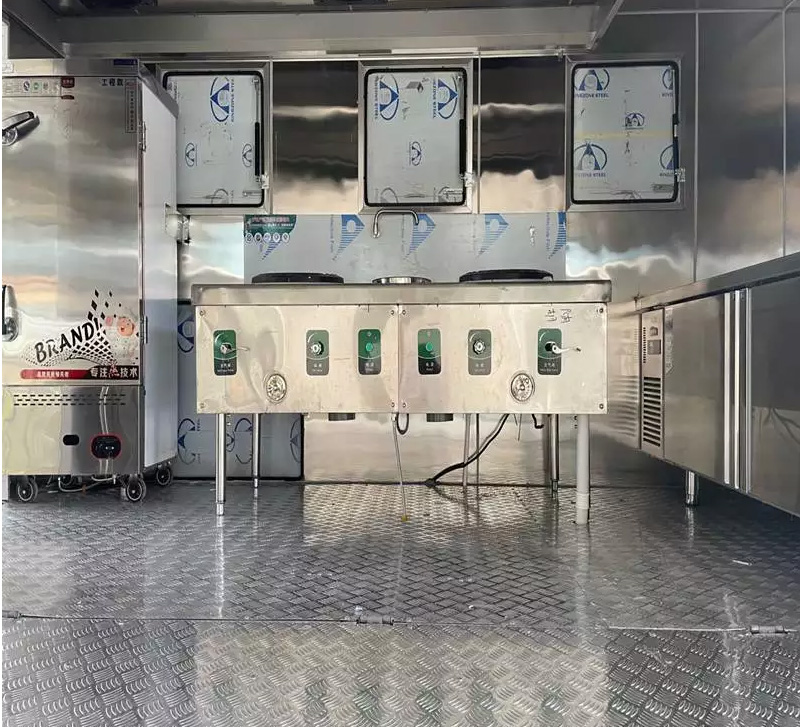 4)配电系统:餐车的设备很多,灶具及蒸箱,冰箱冰柜,热水器、车体电瓶充电系统等配套设备,作业的电力需求大,餐车根据不同设备功率配有独立的配电箱,配有专门的市电接入口,也可选配柴油发电机组。