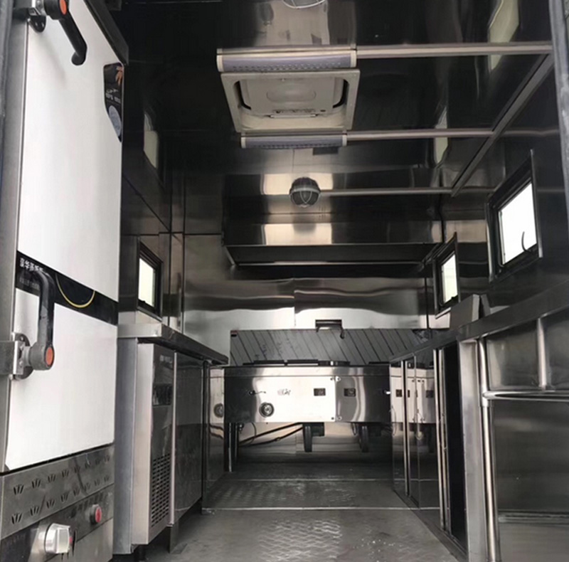餐车装备有主食灶,冷冻柜,炒菜灶,蒸饭设备,炖菜灶,抽油烟机,净水储水设备等厨房煮饭设备,用于野外炊事使用。侧面为裙边结构,后部防护焊接连接, 结合保障餐车实际情况,车内分为煮食区、洗涤区,切菜区,蒸饭区,冷冻冰柜,车辆箱体中部为烹饪区,可以容纳两名厨师作业;适宜野外作业,适应各种特殊环境,普通公路,崎岖山路,泥沙路灯。