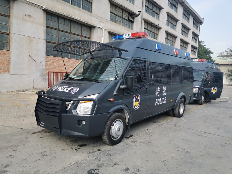 军警车适用于特警、武警用于执勤,追逃,反恐处理突然事件,也可以应用于警戒等需求,集成性安全性舒适性一体的新型警用车辆。车身采用国际流行的楔形装甲车的外型设计。军警车外型威猛刚劲。车身采用进口防弹材料制作并采用跳弹结构,防弹设计。军警车座椅及内饰材料采用真皮软包;军警车加装空调、暖风、换气扇等,保证车内环境的舒适性,射击孔,炮塔等配置丰富,满足各种处突需求。