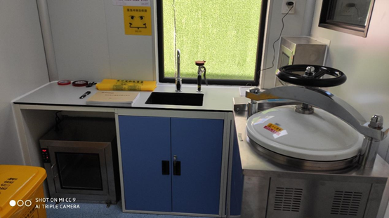 除了各实验室的紫外线消毒车外,显浩PCR实验室设有一个专门的消杀区,该区域配有一台高压灭菌锅,可以对实验器材,个人物品等进行高压杀菌灭毒。