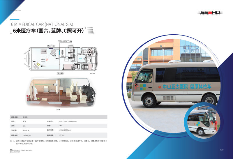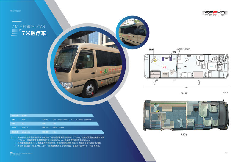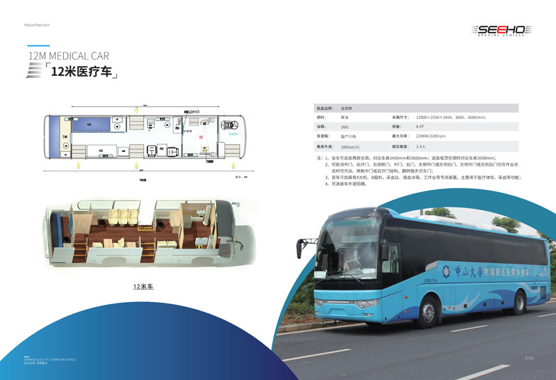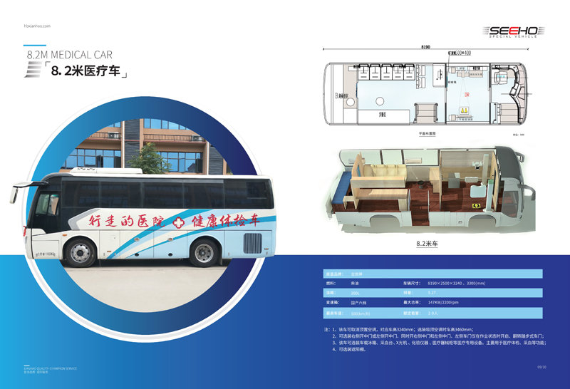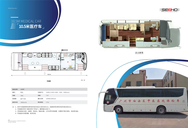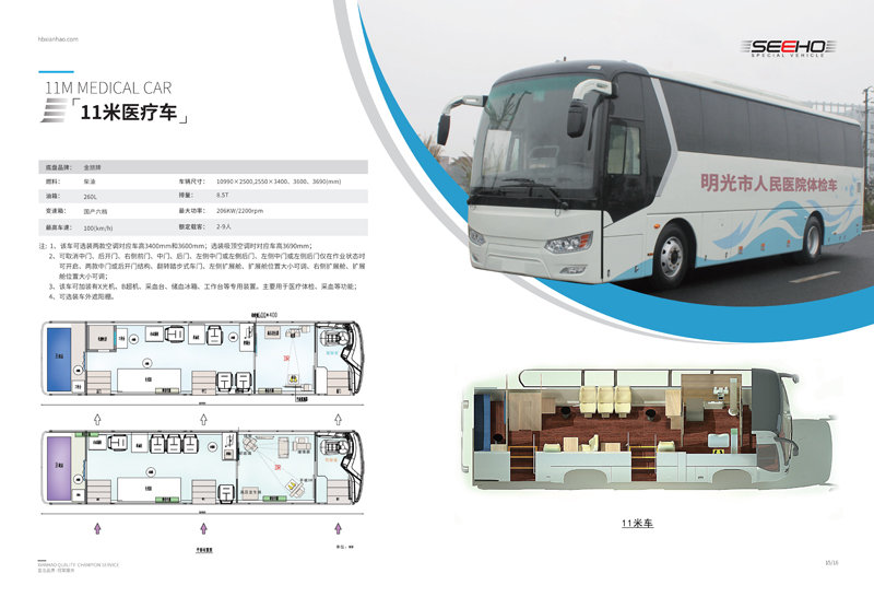 显浩专用车生产的体检车均选用一线品牌车(宇通、金龙、金旅)实用、先进、布局合理、操作方便、驾乘舒适。 体检车长有6米、7米、8.2米、9米、10.5米、11米、12米可选。